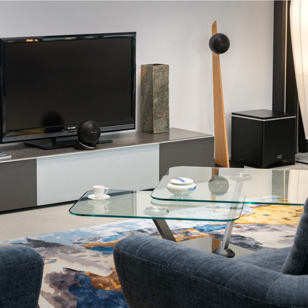 Традиционно направленный горизонтально динамика был заменен вертикальным направленным вниз, который имеет зону излучения в 360°. Преимущества такого решения: фильтруются шумы от воздушного потока, нивелируется явление стоячей волны внутри корпуса, расположение сабвуфера по отношению к стене менее критично. Наконец, низкочастотное воспроизведение становится более чистым и глубоким, всегда живым и динамичным.