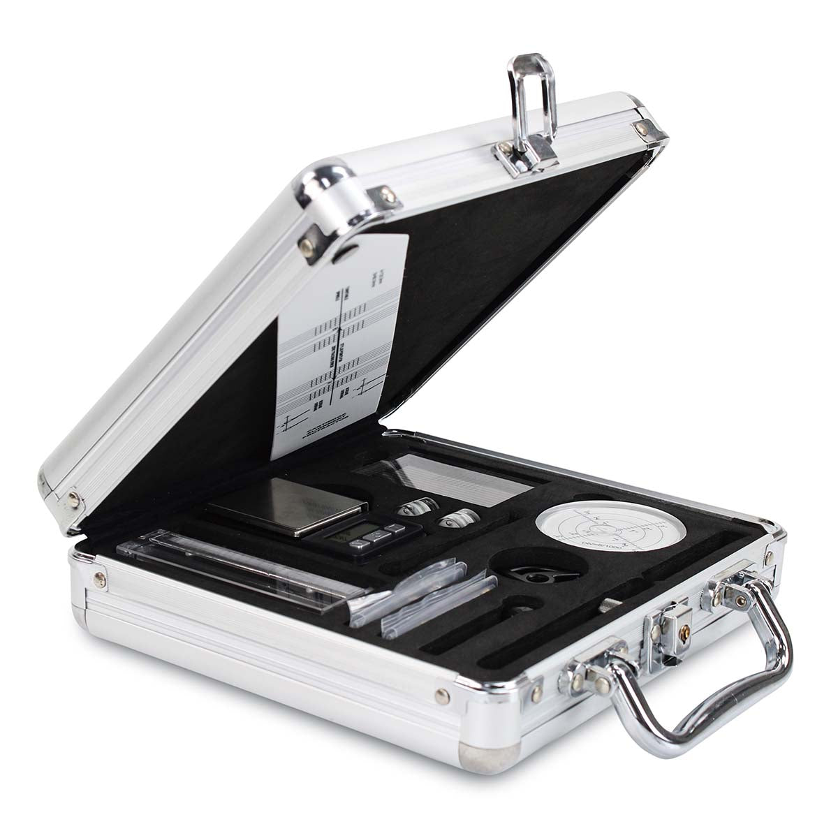 Комплект помогает очищать пластинки и иглу, настраивать прижимную силу, выравнивать проигрыватель и выполнять замену или настройку картриджа. Все аксессуары размещены в алюминиевом кейсе.