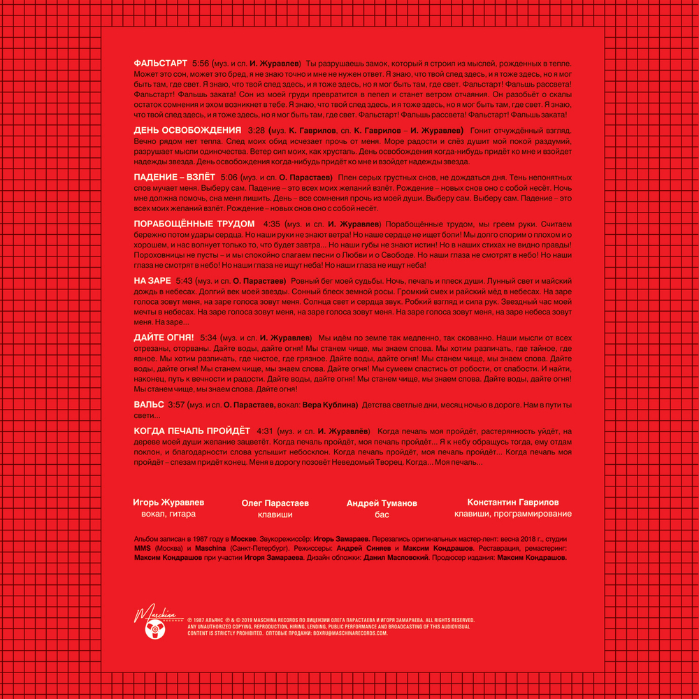 Музыкальное издательство Maschina Records представляет первое официальное издание классического альбома 1987 года «На Заре» на физическом носителе. Новый ремастеринг альбома произведен с использованием оригинальной мастер-ленты. Издание дополнено не изданным ранее бонус-треком, красочным вкладышем с редкими фотографиями и историей создания альбома.