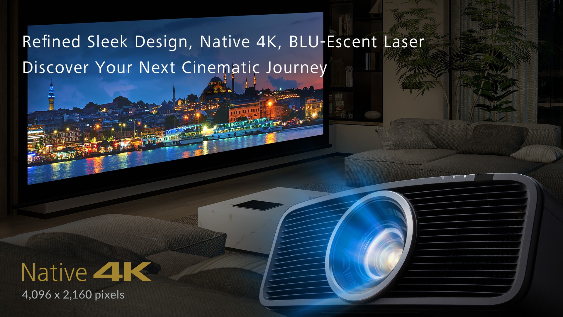 - Лазерный источник света: BLU-Escent обеспечивает яркость до 2300 люмен и ресурс до 20 000 часов, что гарантирует стабильное качество изображения без необходимости замены ламп.