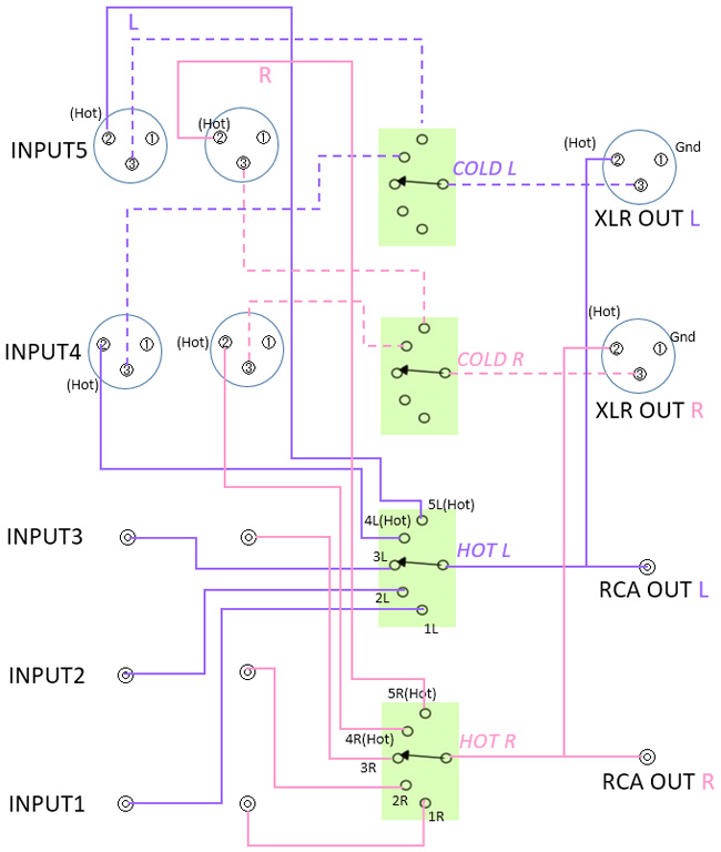 Для входов XLR (line 4, 5) сигналы hot и cold проходят через механические контакты и поступают непосредственно на выход XLR, при этом hot также дублируется на RCA-выход.
