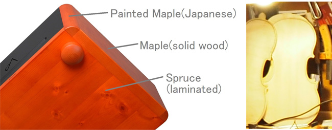 Как и у струнных инструментов, в конструкции используются панели из ели и клена. Эти материалы вибрируют вместе с усилителем и помогают передавать энергию и музыкальность.